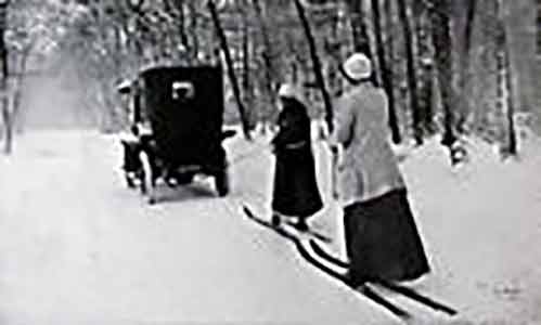 Vintage photo of two females skijoring via automobile | Writer Mariecor | WriterMariecor.com
